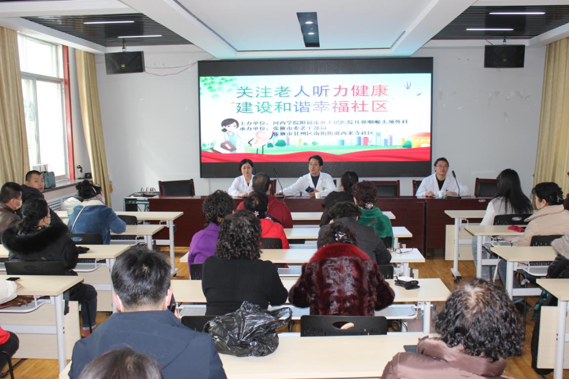 为提高老同志对耳鼻喉疾病的认知,有效预防、管理和改善日常生活中出现的常见问题,在全国第25个“爱耳日”来临之际,3月3日下午,张掖市委老干部局组织市老年大学30多名学员赴西来寺社区,开展“科技助听·共享美好生活”爱耳日健康主题宣教活动。河西学院附属张掖医院耳鼻喉科尹国栋主任及随行医护人员应邀出席活动,并就耳鼻喉疾病预防进行专题讲座,共80多人参加。